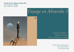 - VOYAGE EN ABSURDIE 3Voyage en Absurdie 3 Un cycle de cinq séances proposé par Nadine BRUNELOT Commençons l’année 2026 de bonne humeur ! Si l’Absurdie avait des frontières, elles seraient rondes avec des angles plats. Si l’Absurdie avait une langue elle serait étrangère avec les mots de nos dictionnaires. Si l’Absurdie était une écriture,… Lire la suite : VOYAGE EN ABSURDIE 3
