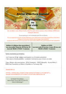 - Ateliers d’écriture du jeudi : mémoire d’une ancienne ferme marseillaise / visio (nouvelles dates)Les jeudis animés par Anne-Claude SIMON-THEVAND Une fois par mois chez l’animatrice : écriture de la mémoire d’un lieu / Une fois par mois en visio Un groupe régulier s’inscrit pour un trimestre de 3 séances. – en présentiel de 14h30 à 17h00 chez l’animatrice (ex-ferme à proximité de la faculté… Lire la suite : Ateliers d’écriture du jeudi : mémoire d’une ancienne ferme marseillaise / visio (nouvelles dates)