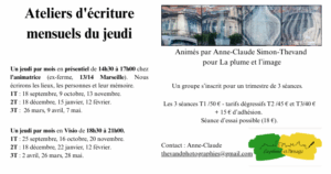 - Ateliers d’écriture du jeudi : mémoire d’une ancienne ferme marseillaise / visio (nouvelles dates)Les jeudis animés par Anne-Claude SIMON-THEVAND Une fois par mois chez l’animatrice : écriture de la mémoire d’un lieu / Une fois par mois en visio Un groupe régulier s’inscrit pour un trimestre de 3 séances. – en présentiel de 14h30 à 17h00 chez l’animatrice (ex-ferme à proximité de la faculté… Lire la suite : Ateliers d’écriture du jeudi : mémoire d’une ancienne ferme marseillaise / visio (nouvelles dates)